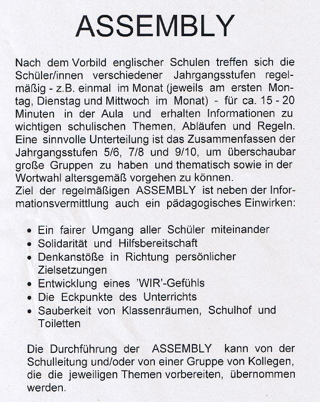 Während die Assembly an britischen Schulen vor allem der Informations-vermittlung dient, werden während der Assembly an der Alkuinschule neben organisatorischen Dingen auch wichtige schulische Themen und Probleme besprochen.