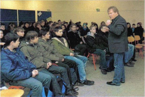 Erstaunlich schnell werden die 130 Teenies ruhig, als Lehrer Ernst Kampmeier zu reden beginnt. Heute steht mal wieder ein Dauerthema auf der Tagesordnung: Der Vandalismus in den Jungenklos.